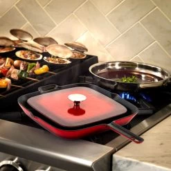 MegaChef 11 Inch Square Enamel Cast Iron Grill Pan With Matching Grill Press In Red With Press