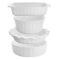 Bake, serve and store foods in the same dish. Timeless design compliments any table setting. Oversized capacities help prevent spillovers. Larger recessed handles provide superior handling. Thinker glass keeps food hot longer. Cleans easily and looks great for years.