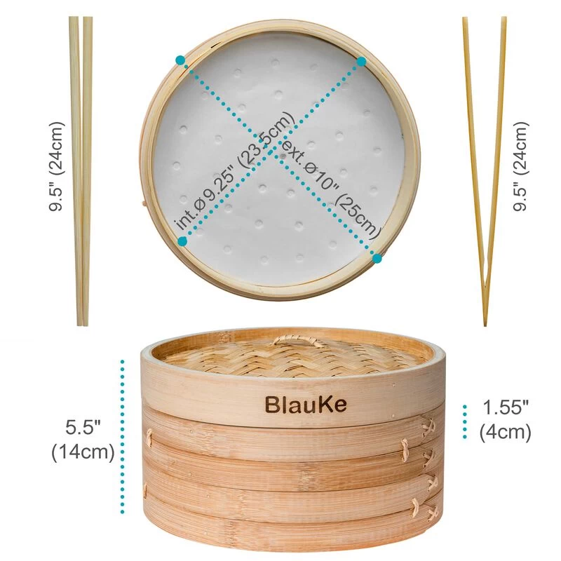 - The dumpling steamer basket has an exterior diameter of 10″ and an interior diameter of 9.25″. Depth of each tier is 1.55″ and total height of the 2-tier steaming basket is 5.5″. This bamboo steamer 10-inch will fit most kitchen pots and woks, and it’s very easy to clean.