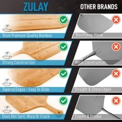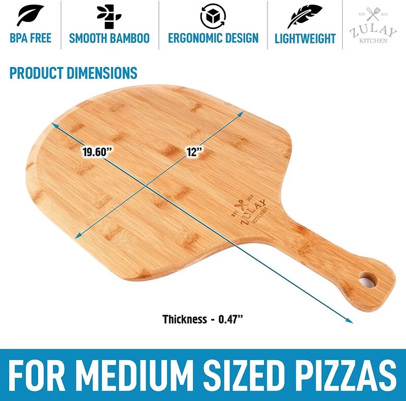 INDISPENSABLE BAMBOO PIZZA PEEL: If you are tired of your old pizza paddle splitting, warping, or cracking, then this wooden pizza peel is made just for you; built with high-quality bamboo wood that provides durability for years to come. The smooth bamboo surface is polished to prevent the dough from sticking, allowing it to slide right off. It measures 19.6 x 12 x 0.47 inches.