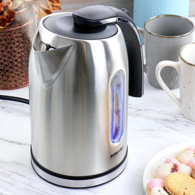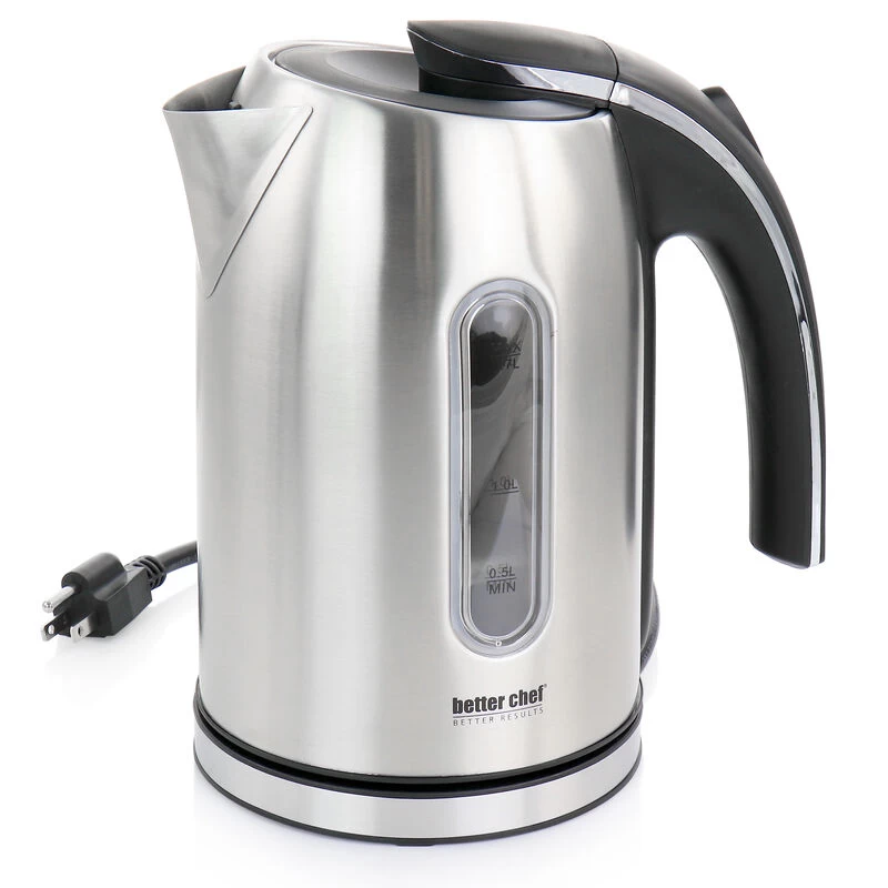 The Better Chef 1.7 Liter 360 Degree Stainless Steel Cordless Electric Kettle is ready to help kick start your mornings. This single 7 cup kettle comes in a sleek enclosed stainless steel design that will accommodate any kitchen. It boils water faster than a standard stove top or microwave. With its stain-resistant body, cleanup is a breeze. Brighten up your day with the kettle’s blue LED water markers! Item Dimensions: 9.00″ x 8.75″ x 6.00″ Item Weight: 2.00lbs