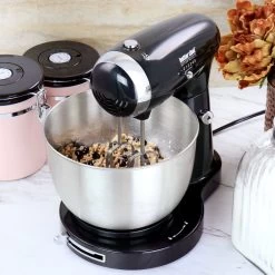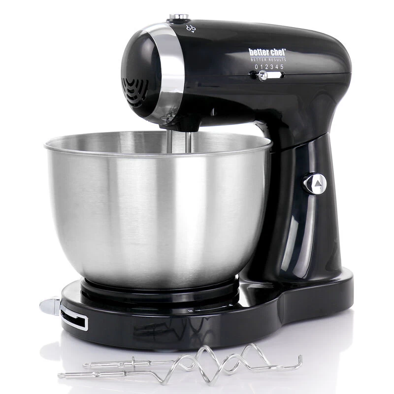 Mix, Blend, Beat and Kneed all with the Better Chef 350 Watt MegaMix Stand Mixer in Black. The 350 Watt motor and 5 speed settings cover most of your everyday mixing needs. Ideal for quickly and easily mixing up your favorite cookie dough’s, mashed potatoes, bread dough’s and so much more. Includes interchangeable beaters and dough hooks and aa locking stainless steel mixing bowl. Dishwasher safe accessories for easy clean up and compact for convenient storage. Item Dimensions: 12.25″ x 11.75″ x 7.80″ Item Weight: 4.10lbs