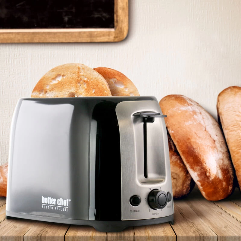 The Better Chef Cool Touch toaster, the perfect choice for any everyday busy body. Made with wide slots to fit more than just bread. Toss in bagels, waffles or Texas Toast for a special morning that demands for something better than basic toast. Reheat cold toast or defrost premade waffles with the reheat and defrost buttons. Make a quick snack just the way you want it with the simple adjustable browning control. The toaster includes a quick cancel button and an easy to clean crumb tray. Its built with a cool-touch exterior and you your safety and convenience in mind. Measures: 10.75″ x 7″ x 7″ * Cool-touch exterior keeps the heat off * Extra wide slots for bagels, waffles and more * Reheat function; just press a button * Defrost function for frozen foods * Bread guides for even toasting on either side * Variable browning control * Stylish stainless accents Item Dimensions: 6.00″ x 5.00″ x 5.00″ Item Weight: 1.00lbs