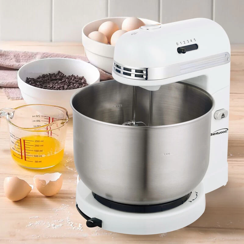 With the Brentwood 5 Speed Stand Mixer with 3.5 Quart Stainless Steel Mixing Bowl in White, home chefs can save time and effort. Use this kitchen gadget to easily beat eggs, whip cream, mix batter and more. Control speed and eject beaters with one hand. Includes dishwasher safe chrome plated beaters and dough hooks for easy clean ups. Item Dimensions: 12.00″ x 11.00″ x 8.25″ Item Weight: 4.40lbs
