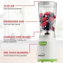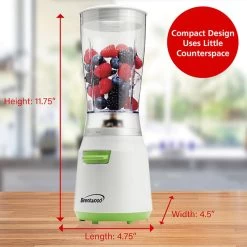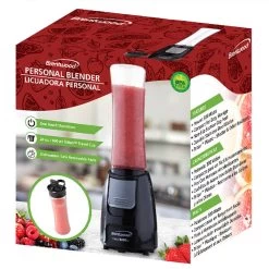 Blend-To-Go Personal Blender – Black w/ Gray Button One-Touch Blending Action 20oz Capacity Bottle made with Odor and Impact Resistant TRITAN Plastic BPA Free Bottle To GO Lid Included Dishwasher Safe Jar and Parts Durable Stainless Steel Blades Non-Skid Base Power: 300 Watts Item Dimensions: 12.00″ x 5.00″ x 5.00″ Item Weight: 2.20lbs