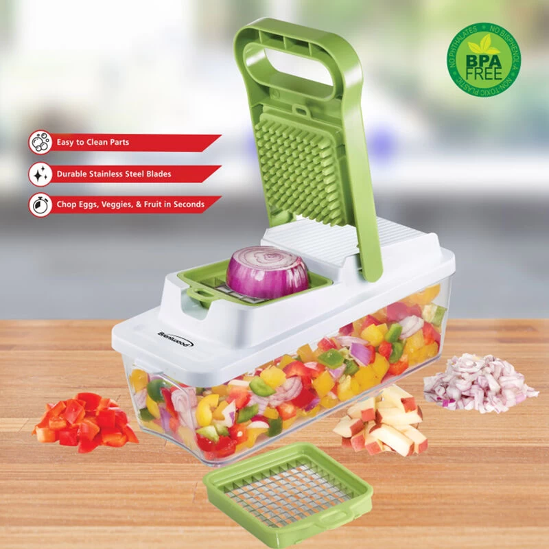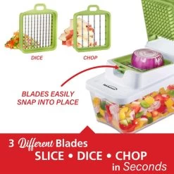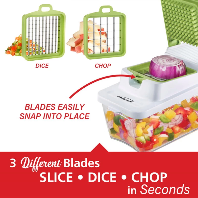 Use the Brentwood food chopper with storage container to chop all your favorite veggies quickly and with less mess! Just change out the included blade attachments to choose your chopping style and size. Container lid comes with a chopper compartment, just push veggies down with lid and they will cut and land right into the included storage container. Put together salsas, salads, and fresh snacks with this convenient mess free dicer! Item Dimensions: 11.25″ x 4.50″ x 5.25″ Item Weight: 1.40lbs
