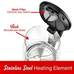 Brentwood Glass 1.7 Liter Electric Kettle with 6 Temperature Presets boils water faster than a microwave and safer than a stove top kettle. Water boils within minutes with a single push of a button. Brew the perfect cup of coffee and masterfully steep all kinds of tea thanks to the 6 smart temperature presets. Quick boil selection for instant foods like oatmeal, noodles, and more. Gorgeous blue LED lights up the glass kettle while boiling. Cordless kettle lifts off the 360° swivel base for easy filling and pouring. Full glass kettle with stainless steel heating element and BPA Free parts keeps water free of impurities. Includes boil dry and overheat protection for added safety. Unit automatically shuts off once water reaches desired temperature. Item Dimensions: 6.00″ x 9.00″ x 9.50″ Item Weight: 2.00lbs