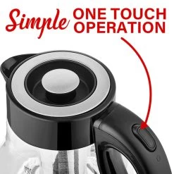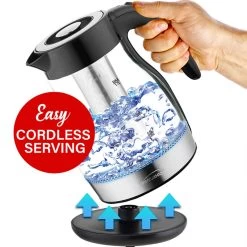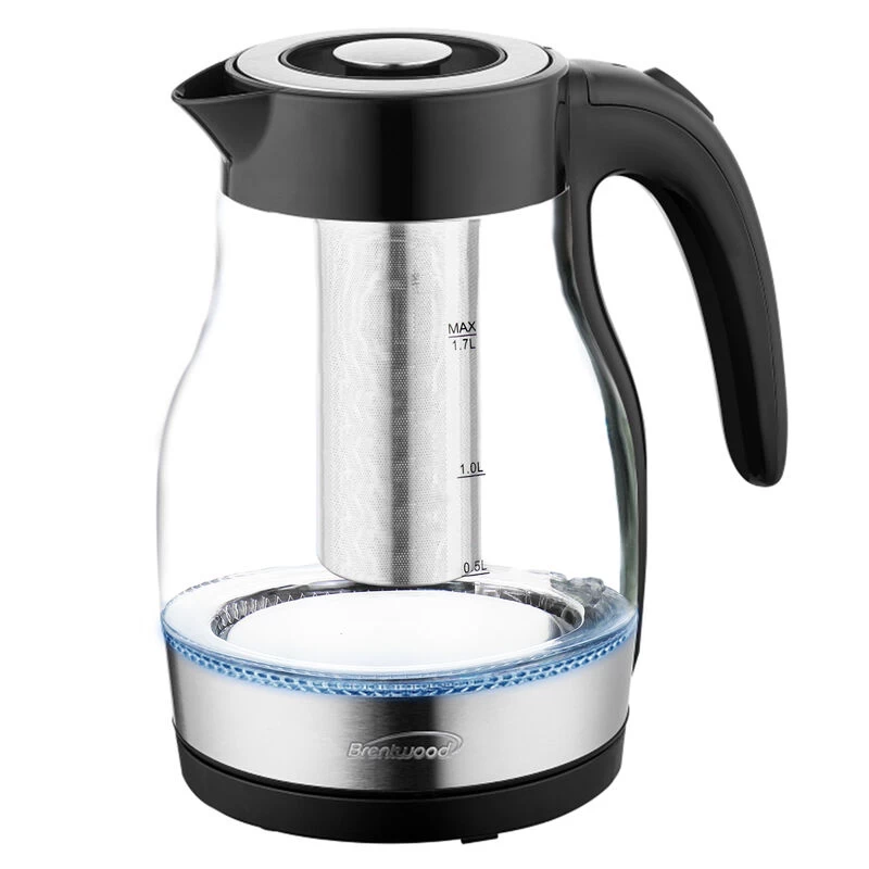 The Brentwood 1.7L Cordless Glass Electric Kettle with Tea Infuser, Black boils water faster than a microwave and safer than a stove top kettle. Water boils within minutes with a single push of a button. Gorgeous blue LED lights up the glass kettle while boiling. Cordless kettle lifts off the 360 swivel base for easy filling and pouring. Conveniently make hot tea, French press or pour over coffee, instant oatmeal and more. Full glass kettle with food grade stainless steel tea infuser, concealed heating element and BPA Free parts keeps water free of impurities. Includes boil dry and overheat protection for added safety. Unit automatically shuts off once water reaches a boil. Item Dimensions: 6.00″ x 6.00″ x 8.50″ Item Weight: 2.20lbs