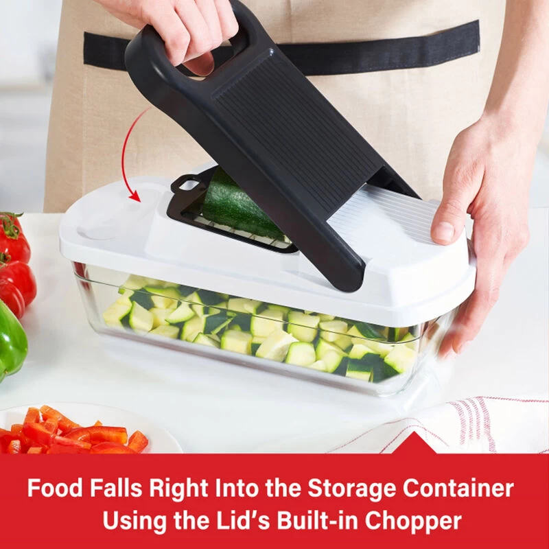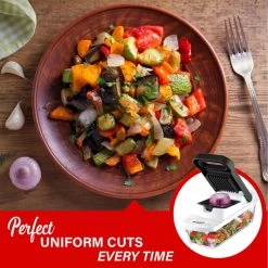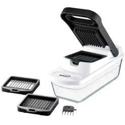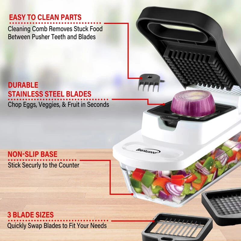 Use the Brentwood food chopper with storage container to chop all your favorite veggies quickly and with less mess! Just change out the included blade attachments to choose your chopping style and size. Container lid comes with a chopper compartment, just push veggies down with lid and they will cut and land right into the included storage container. Put together salsas, salads, and fresh snacks with this convenient mess free dicer! Item Dimensions: 11.25″ x 4.75″ x 5.00″ Item Weight: 1.40lbs