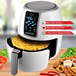 Use the powerful 1400 watt Brentwood 4-Quart Small Electric Air Fryer to fry foods to perfection quickly and evenly without the guilt of extra fat and calories. Our air fryer requires little to no oil to beautifully cook French fries, onion rings, chicken wings, steak, roasted veggies and more. Use the quick reference temperature guide and the 30 minute timer with auto shut off for fast, crispy results. Easily adjust the temperature between 170°F to 400°F. Cool touch, removable fry basket make serving easy. The frying pan and basket is made with a non-stick surface for effortless clean up. Item Dimensions: 12.20″ x 12.20″ x 10.50″ Item Weight: 3.80lbs