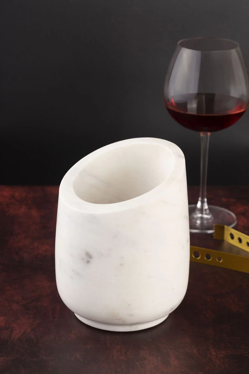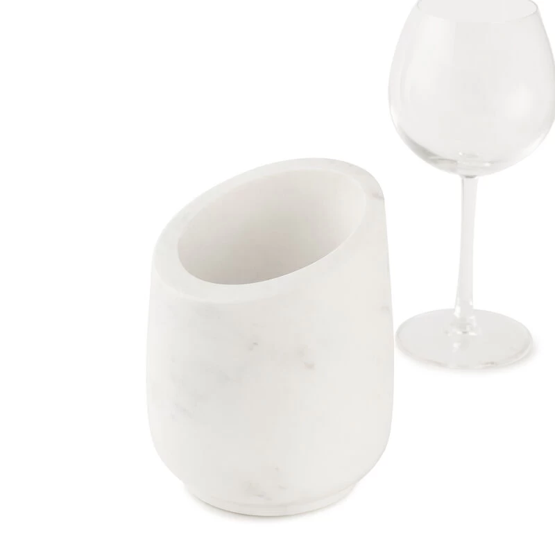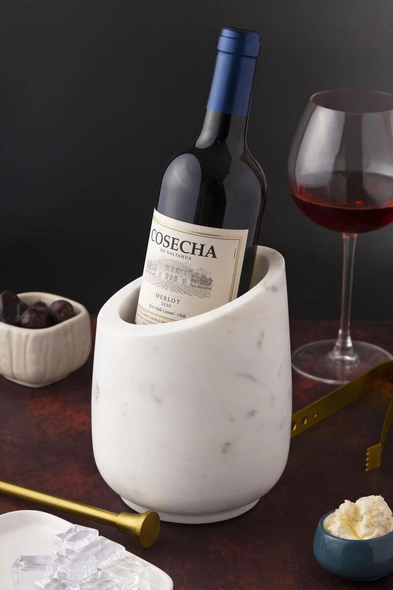 Add elegant sophistication to seasonal gatherings with GAURI KOHLI wine bottle chiller that celebrates the dramatic beauty of the stonemason’s art. Providing memorable presentation for a bottle of wine, this graceful wine bottle holder is distinguished by rich hues and intricate markings of real marble. Watertight construction doubles as a vase when the bottle’s gone.