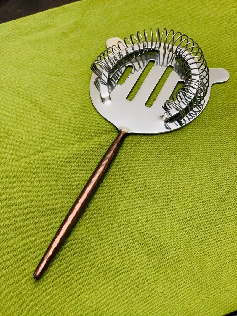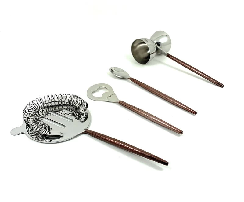 This handmade bar tool accessory is designed by artisans in silver and Copper Color combination. The handle of these tools are hammered and has pvd coating in Copper color. The shape of handle is little pointed and sleek but sturdy. These are dishwasher safe and food safe.