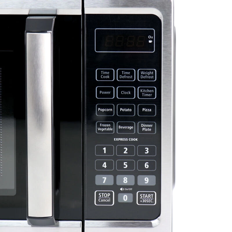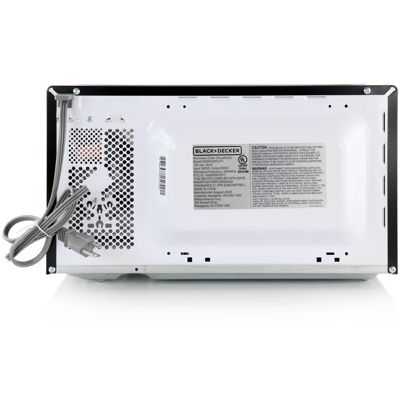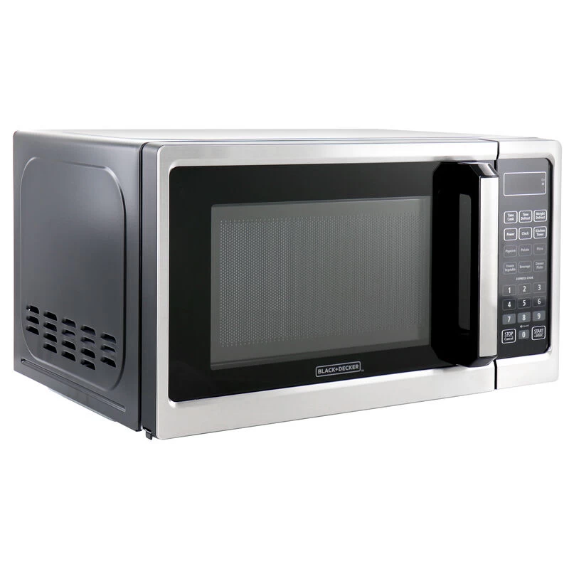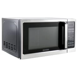 This professional-style Black + Decker 0.9 Cubic Foot 900 Watt Stainless Steel Microwave features 10 power levels, removable glass turntable and a spacious interior. Optimally cook or reheat six of the most popular food items with the touch of a button. Choose power levels up to 900 watts.The large LED digital display has a clock function and can also display a countdown timer as well as the cooking time remaining.Easily open the microwave with the push-button. Item Dimensions: 15.00″ x 18.50″ x 10.00″ Item Weight: 23.00lbs
