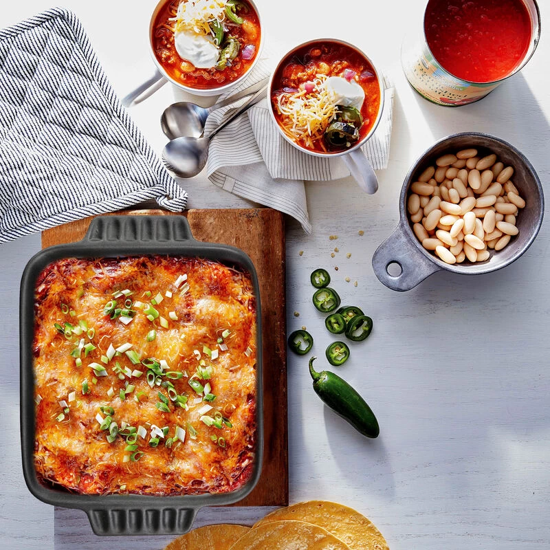 Bring your culinary creations to life with the Denhoff 8 in. rectangular casserole dish in red. This non-stick stoneware is perfect for making a meal for the whole family, or just a healthy treat for yourself and friends. This piece has ribbed sides for a sleek look and has contoured handles for easy gripping when hot. Item Dimensions: 12.00″ x 10.00″ x 4.00″ Item Weight: 4.00lbs