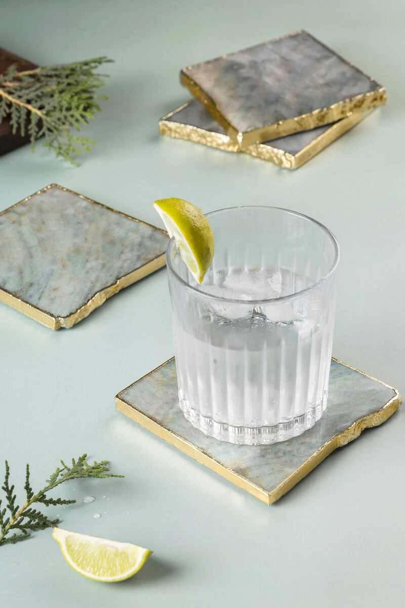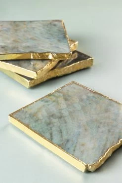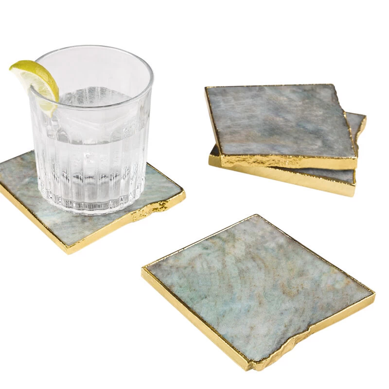 Our aventurine agate stone coasters protect your beautiful kitchen surfaces, tabletops, dining tables or bar counters from drink ring stains. These semi-precious stone coasters with gold gilded edges, are handcrafted by skilled artisans from Rajasthan, India.