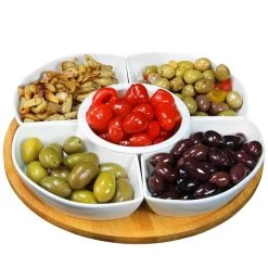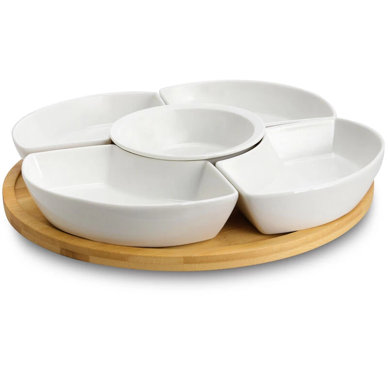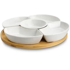 Wow your guests with the beautiful and elegant serve ware set from the Elama Signature Collection. Elegant serving bowls are constructed of stoneware that are microwave and dishwasher safe. Convenient Lazy Susan serving tray is constructed of beautiful Bamboo. Set Includes: 4 x 8oz. Serving bowl 1 x 6oz. Center Serving bowl 1 x Lazy Susan Bamboo Serving Tray Care instructions Serving bowls are dishwasher and microwave safe. Tray is recommended to be wiped clean with a damp towel. Item Dimensions: 12.25″ x 12.25″ x 2.25″ Item Weight: 1.94lbs