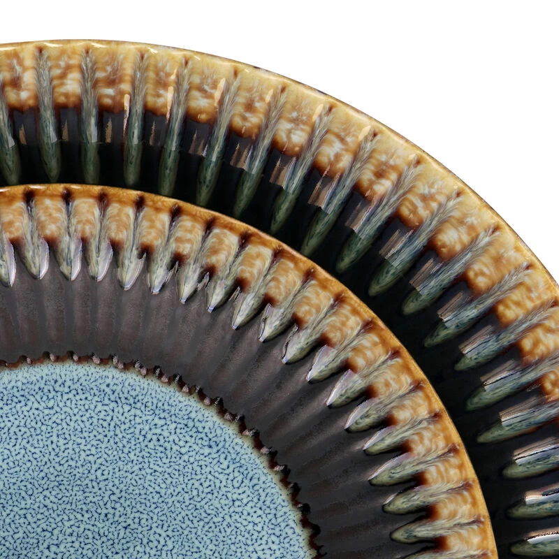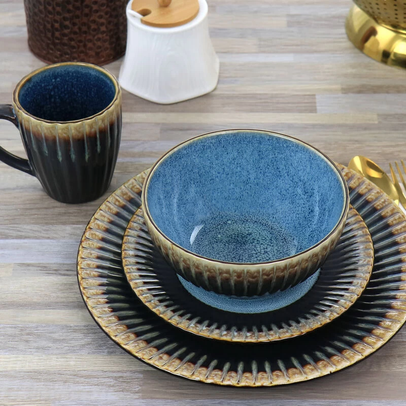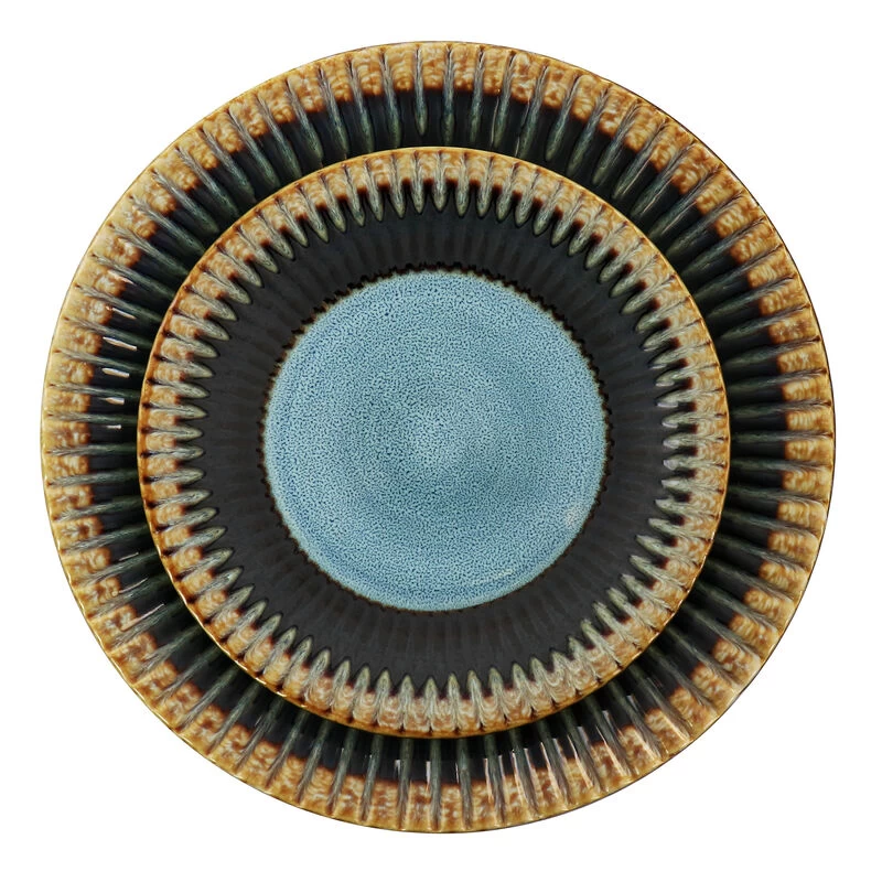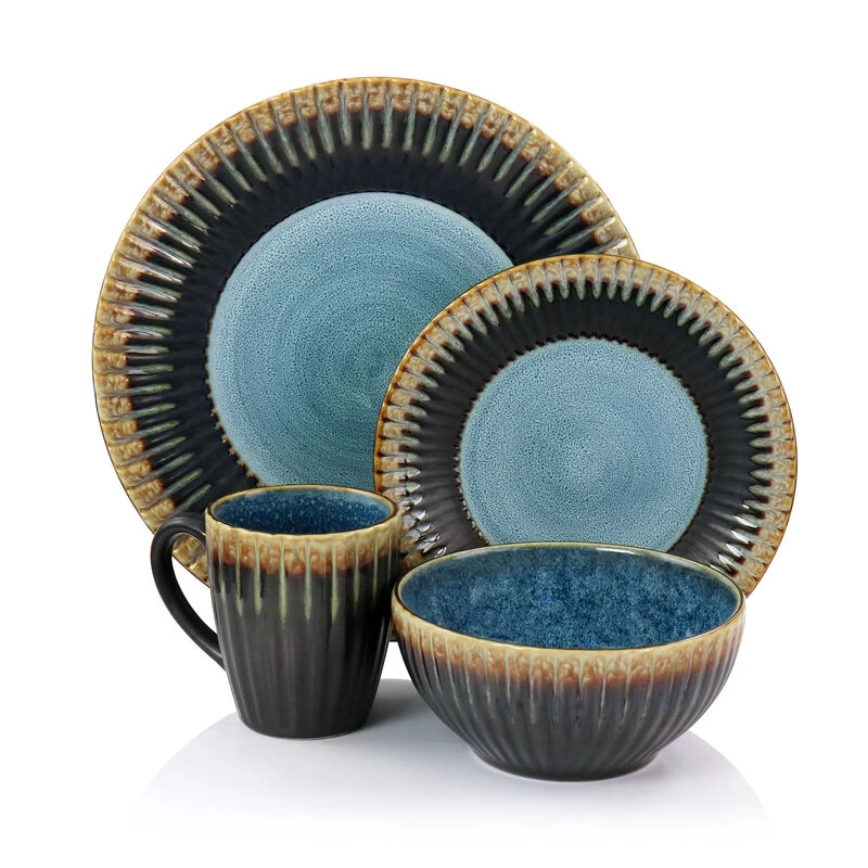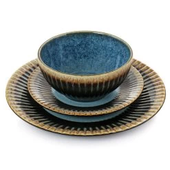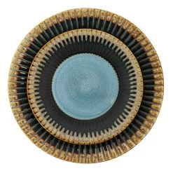 Create a new dining experience with the Elama Tavilla 16 Piece Round Textured Stoneware Dinnerware Set in Multi Color. This beautiful and bright dinnerware setting is perfect for special occasions but strong and sturdy for every day use. Constructed of Stoneware, each dish is microwave safe for quick and easy reheating and dishwasher safe for convenient cleaning. Both dinner plates and salad plates have a beautifully thick textured Brown and Cream brim with a breathtaking shade of blue in the center while the bowl and mug are textured all thorough the outside of each piece and displaying the blue on the inside, leaving you with a stunning table setting. Item Dimensions: 14.50″ x 12.50″ x 13.00″ Item Weight: 21.30lbs