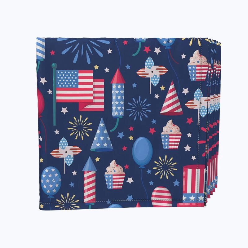18″ x 18″ Napkins. Set of 4. Made in the USA, 100% Milliken Spun Polyester. Hemmed Edges. Product is printed. Machine Washable: Warm water wash, cold rinse, tumble dry low. Light Iron touch up as needed. Will soften after each wash to a cotton feel. Engineered to resist stain absorption and linting. Perfect for any and all occasions at home, hotels & restaurants alike!