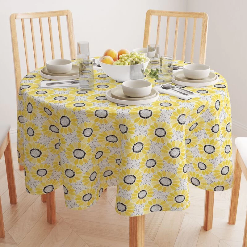 60″ Round Tabelcloth (size is of tablecloth not table). Made in the USA, 100% Milliken Spun Polyester. Merrowed Edges. Seamless cloth. Product is printed. Machine Washable: Warm water wash, cold rinse, tumble dry low. Light Iron touch up as needed. Will soften after each wash to a cotton feel. Engineered to resist stain absorption and linting. Perfect for any and all occasions at home, hotels & restaurants alike!