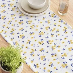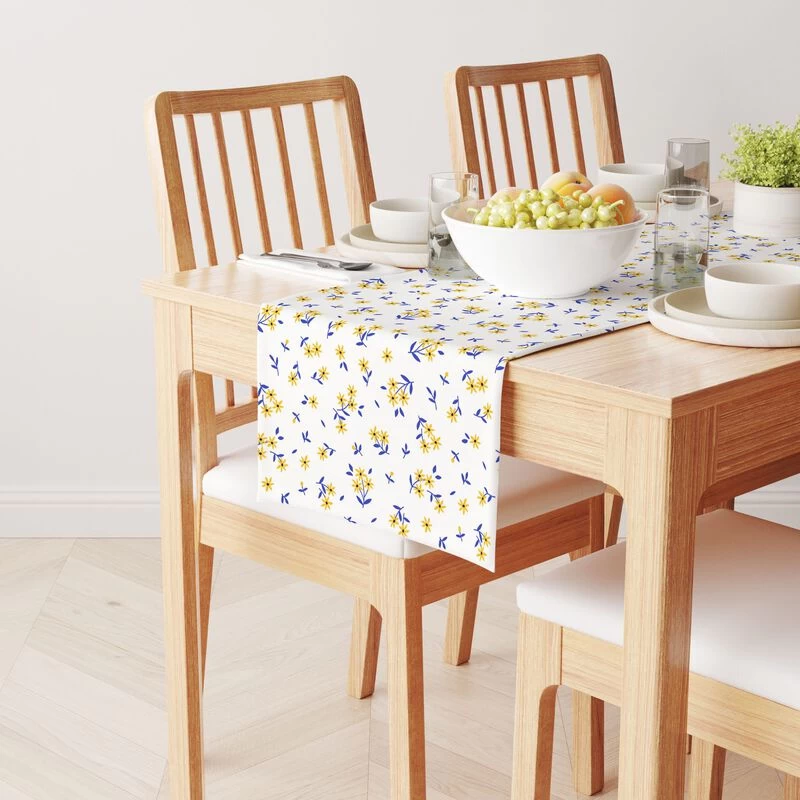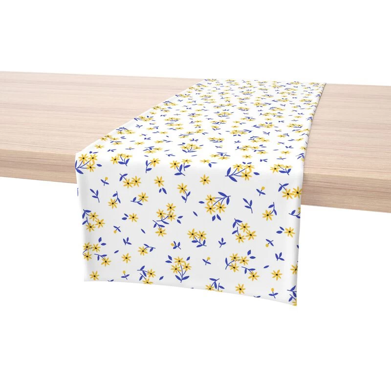 16″ x 90″ Table Runner. Printed and Sewn in the USA, 100% Cotton. Hemmed Edges. Machine Washable, Gentle Cycle with Light Iron touch up as needed. Our Cotton is a natural fiber woven twill fabric. Perfect for all occasions!