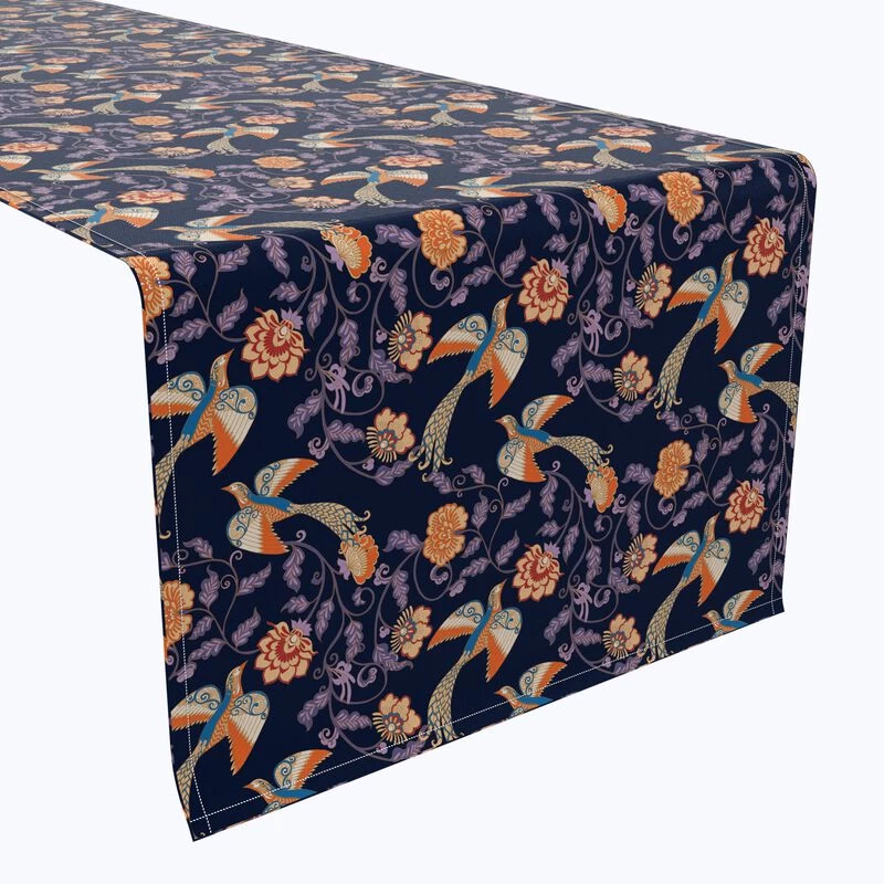 16″ x 108″ Table Runner. Printed and Sewn in the USA, 100% Cotton. Hemmed Edges. Machine Washable, Gentle Cycle with Light Iron touch up as needed. Our Cotton is a natural fiber woven twill fabric. Perfect for all occasions!