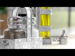 The Walford Home Salt & Pepper Set with Caddy includes 2 shakers and a caddy/holder with a padded base. The caddy is made of heavy gauge .27mm steel with a galvanized finish, the shakers are glass with chrome tops. Caddy with Handle: 3.75(L) x 1.9(W) x 4.9(H) in; Caddy without handle: 3.75(L) x 1.9(W) x 1.9(H) in; Glass shakers: 1.65(L) x 1.65(W) x 3.9(H) in.