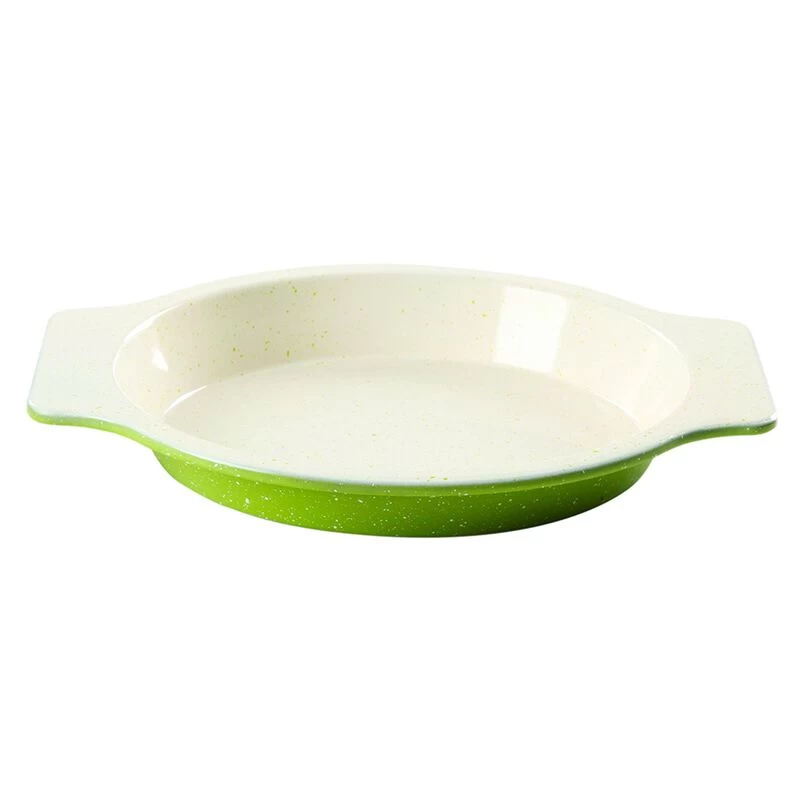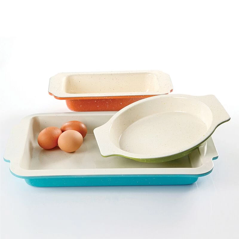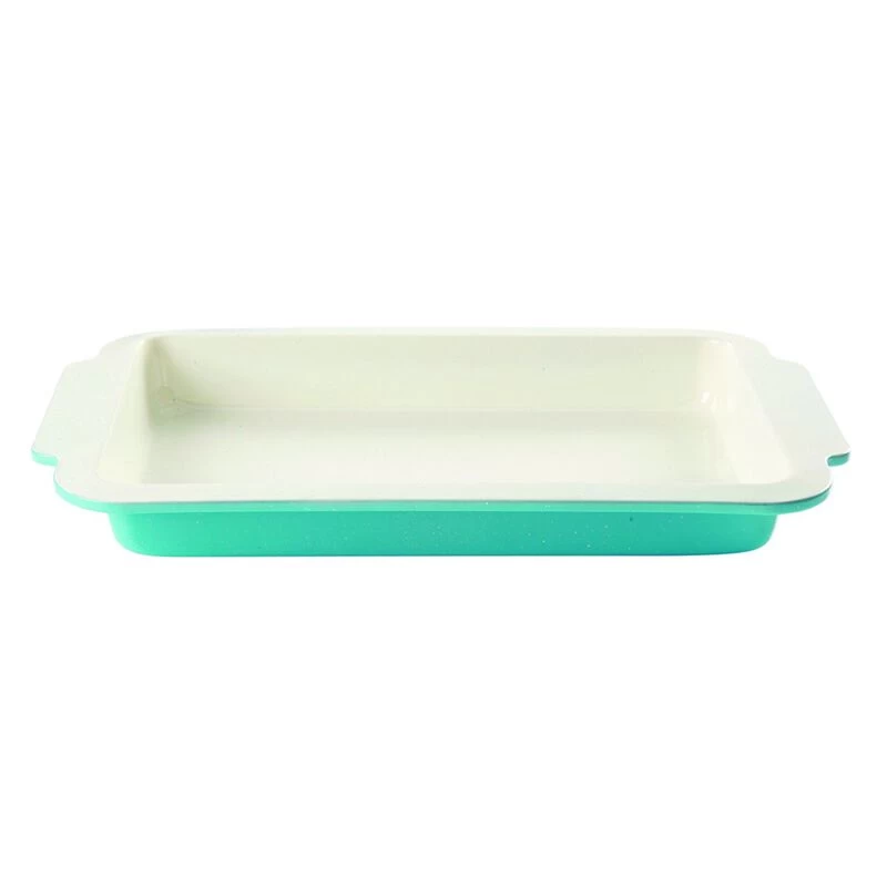 The ColorSplash Imbue 3 Piece Bakeware Set is ideal for preparing all sorts of delicious baked concoctions. The ceramic nonstick interior ensures easy food release and cleanup. The thick walls allow for even heat distribution for perfect browning while your baked goods are in the oven. The set includes: One 8.5″ Width, 4.25″ Length Loaf Pan One 8″ diameter, 1.2″ Height Round Cake Pan One 13″ Width, 8″ Length, 2″ Height Cake Pan Perfect for baking cake, cookies, bread, quiche, pie and more! Item Dimensions: 8.00″ x 13.00″ x 2.00″ Item Weight: 1.55lbs
