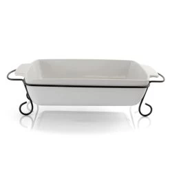 The Gibson Elite 2 piece 15.5 inch stoneware bakeware with metal rack really puts the feast together. This 2 piece serving set features a rectangle bakeware container made of stoneware. Its oven safe so you can cooking and directly bring it from the oven to the dinning table. Display your wonderful meal with the matte black metal rack that keeps the heat away from the table’s surface. Serve just about anything you can think of, from peach cobblers and apple strudels to baked tilapia and stuffed chicken breasts. Perfect for any large gatherings, use it to display a side dish or show off the main course! Item Dimensions: 17.00″ x 4.00″ x 8.00″ Item Weight: 5.45lbs