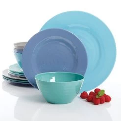 The Gibson Home Brist 12 piece melamine dinnerware set features four assorted colors – blue, gray, chameleon and periwinkle blue – bringing a fun vibe to everyday dining. All pieces are made of chip-resistant melamine which makes them great for everyday use. This set is also great for outdoor activities such as picnics or camping. Bring this set home today! Set includes: Four Dinner Plates 10.5 x 10.5 x 0.50 – 30oz Four Salad Plates 8 x 8 x 0.50 – 24oz Four Bowl 6 x 6 x 3 – 6oz The bowls have 20oz or 2.5cups liquid capacity Features: * Made of durable, chip resistant melamine * Comes in four assorted colors * Dishwasher safe (top rack) * Not microwave safe Item Dimensions: 10.75″ x 10.75″ x 1.00″ Item Weight: 0.60lbs