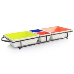 The Gibson Home Crenshaw 5 Piece Hand Painted Stoneware Sectional Tray Set with Metal will bring sophistication to any table setting. This porcelain serving set features a variety of sizes and colors making it ideal for serving appetizers, be it a main course or desserts. The vibrant assorted hand painted finish will blend seamlessly with a wide array of colors and motifs. Item Dimensions: 20.50″ x 7.25″ x 2.50″ Item Weight: 5.30lbs