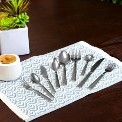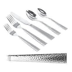The flatware set is complete for 8 people. The set is perfect for your everyday use or when you have guests over. The set is at the right weight when you hold the utensils. The set has a perfectly hammered handle for a great grip. The set will have your guests enjoy the food in class. The Set includes: * Dinner Knife x 8pcs 1.4mm * Dinner fork x 8pcs 1.4mm * Dinner spoon x 8pcs 1.4mm * Teaspoon x 8pcs 1.2mm * Salad fork x 8pcs 1.2mm * Serving spoon x 1pc 1.4mm * Slotted serving spoon x 1pc 1.4mm * Serving fork x 1pc 1.4mm * Butter knife x 1pc 1.2mm * Sugar shell x 1pc 1.2mm Item Dimensions: 11.00″ x 10.00″ x 2.75″ Item Weight: 2.60lbs