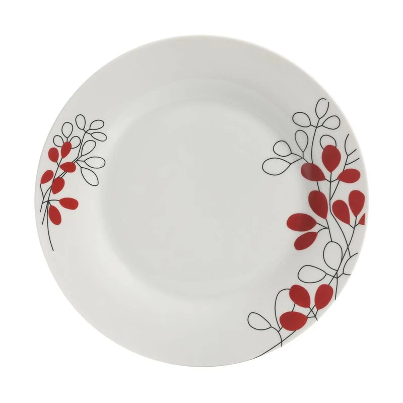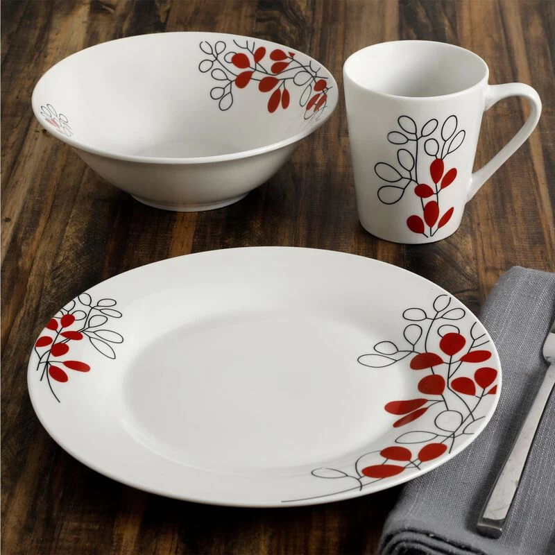 The Scarlet Leaves 12 Pc. Dinnerware Set from Gibson adds a casual elegance to any tabletop. Table displays a beautiful red and gray leaf design, ideal for all occasions. Gather your friends and family around the table for a large gathering or use it for more casual dinners, the Porcelain pieces are durable for everyday use. Service for 4. Microwave safe for quick reheating and dishwasher safe for easy cleaning. Included in the set are four 9″ dinner plates, 7″ bowls and 9 oz. mugs. Features a beautiful decorative stripe design Serves up to 4 people Dishwasher safe Item Dimensions: 9.00″ x 9.00″ x 0.75″ Item Weight: 0.23lbs