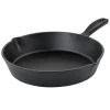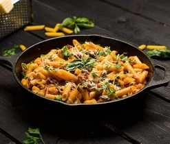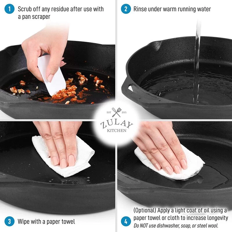 This cast iron skillet distributes heat evenly and has high resistance to hot temperatures. Ideal for searing, simmering, stewing, baking, roasting, frying, sautéing meats, vegetables and much more. Rinse with hot water, use a brush and salt to remove any traces of food. Dry well with a towel or on the stove over low heat, then drizzle a little oil all over the pan before storing in a dry place.