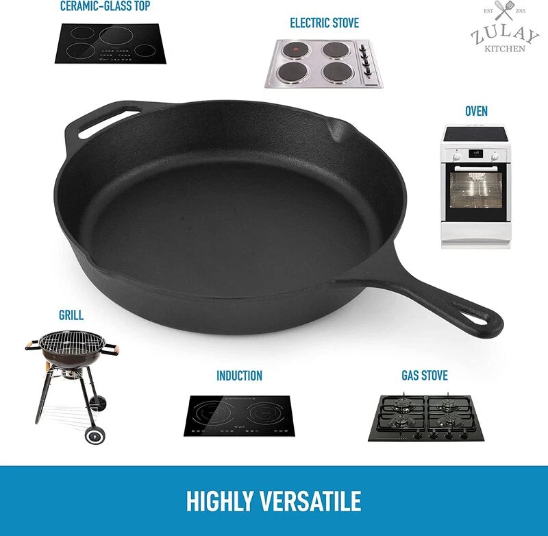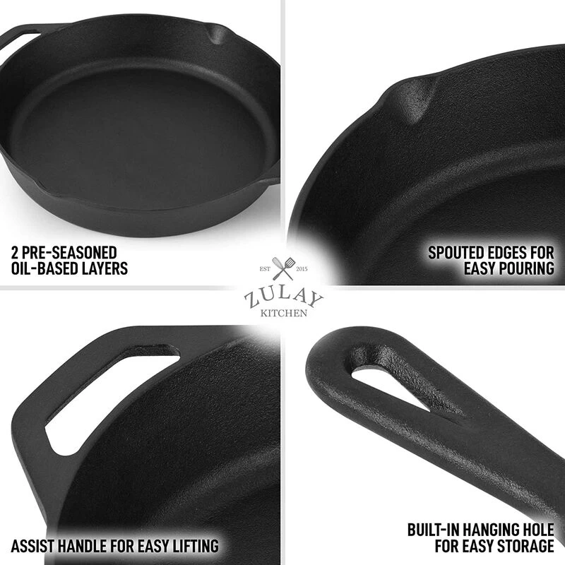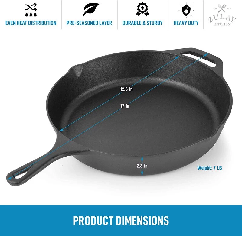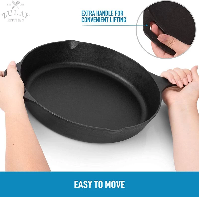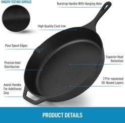 Constructed of high-quality heavy-duty and extremely durable iron that is double-coated with pre-seasoned oil base. Designed with an ergonomic handle along with an assist side grip for easy two handed operation.
