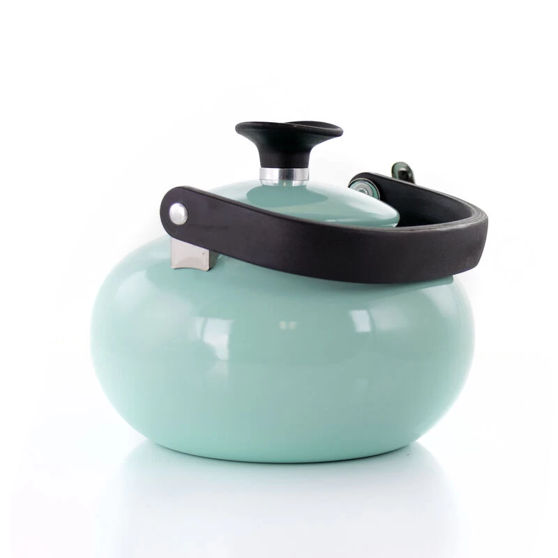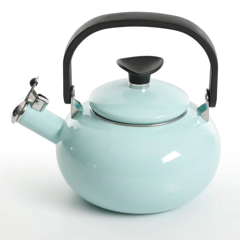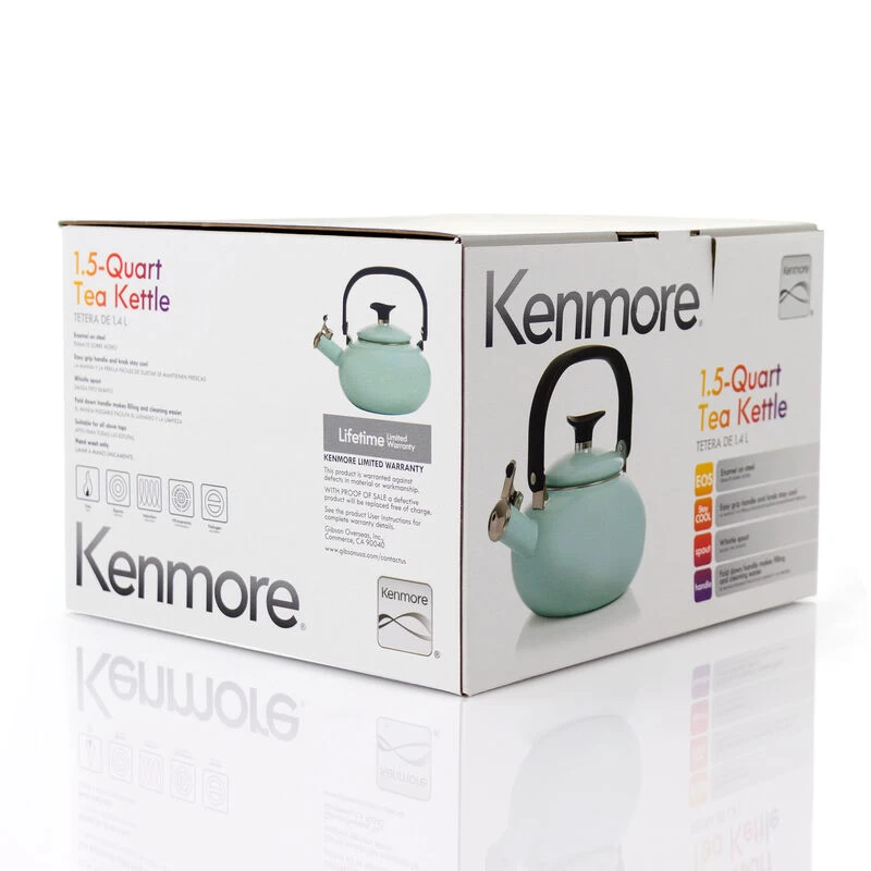 Get the day going right with the Kenmore 1.5 Quart Enamel On Steel Whistling Tea Kettle. The enamel on steel body boast durable construction while providing visual appeal for the standard kitchen. An easy grip handle remains cool as water is brought to a boil for easy handling. The built-in whistle spout alarms you as soon as the water is ready. Great for morning tea, later night coffee, or for preparing instant noodles for lunch. Item Dimensions: 9.00″ x 8.00″ x 6.00″ Item Weight: 2.00lbs