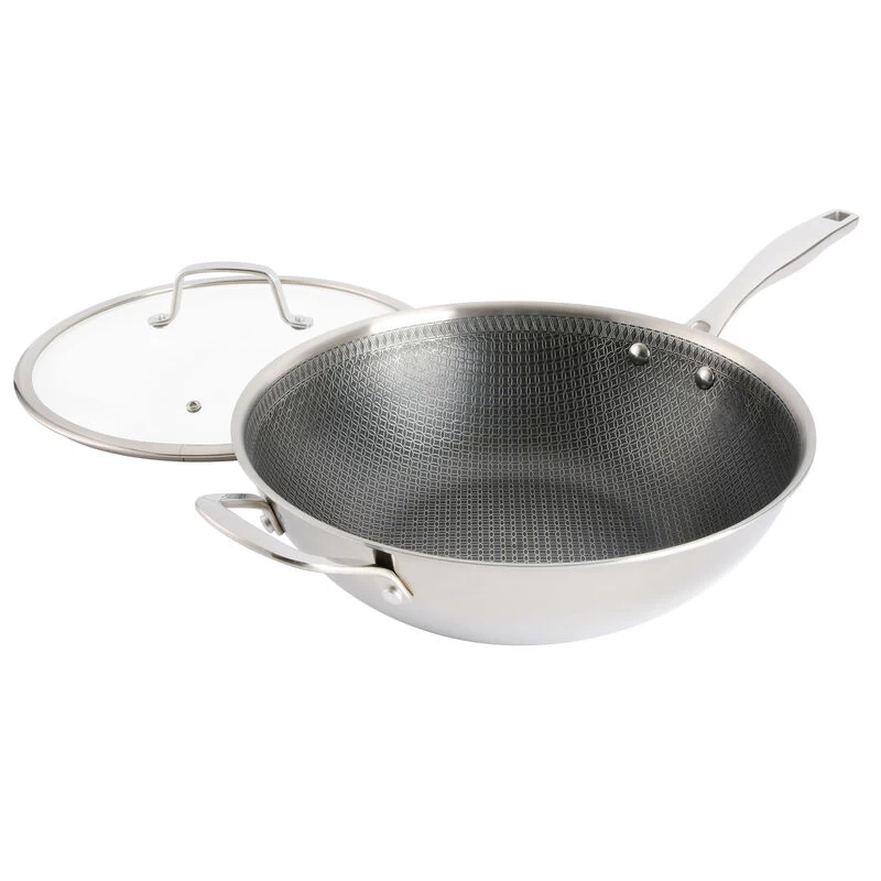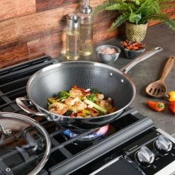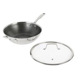 Master easy and gourmet recipes using the Kenmore Elite Luke 12-inch Stainless Steel Wok with Lid. Made from premium, Tri-ply stainless steel with seamless base-to-rim aluminum core, it distributes heat evenly for no-hotspot results. It features an integrated, multi-surface interior to prevent scratches from metal utensils, while promoting healthier, nonstick cooking styles and easy food release. With double-riveted handles, this wok offers a comfortable and secure grip, perfect for tossing, mixing, and serving. Monitor your food’s cooking progress through its tempered, vented glass lid that retains flavors but lets steam and moisture escape. Use this on all stove-tops and in the oven up to 500°F without the lid, 350°F with the lid. Item Dimensions: 21.50″ x 12.50″ x 7.00″ Item Weight: 4.00lbs