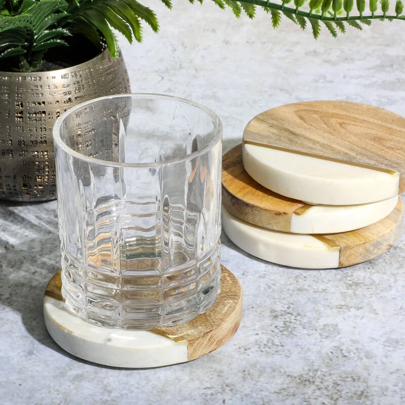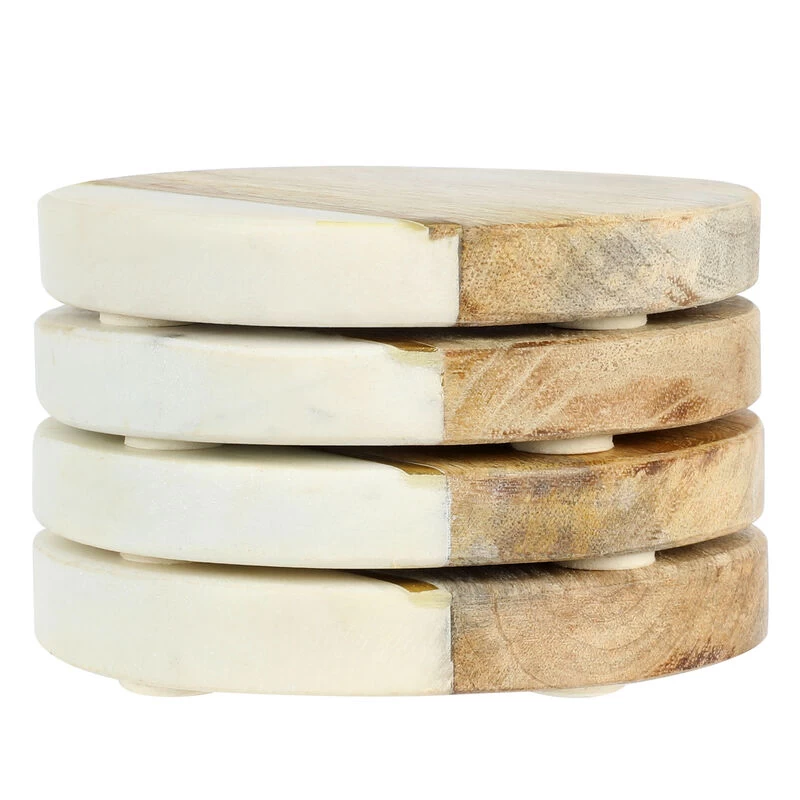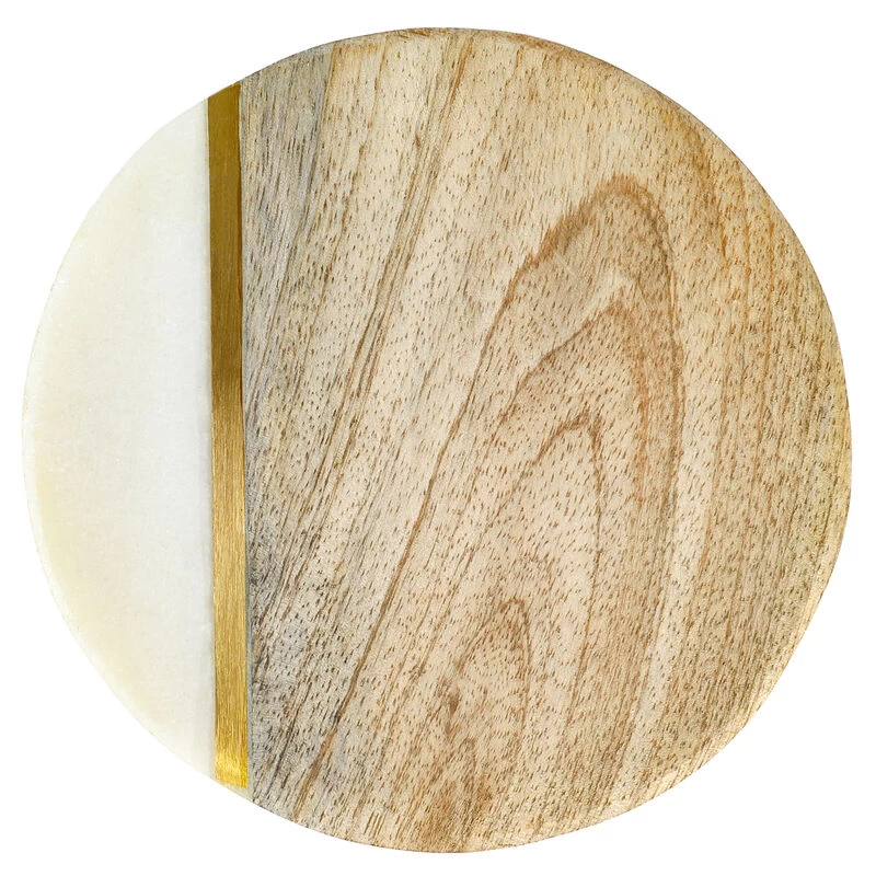 The Laurie Gates 4-Piece Mango Wood & Marble Coaster Set is perfect for entertaining friends and family at home. Handcrafted in India, warm Mango wood and white marble with a metallic gold accent give these round coasters a one-of-a-kind feel that adds contemporary style to cocktail hour. Elevate any table and get your guests talking with this stunning set of round coasters. Item Dimensions: 4.00″ x 4.00″ x 0.50″ Item Weight: 0.35lbs