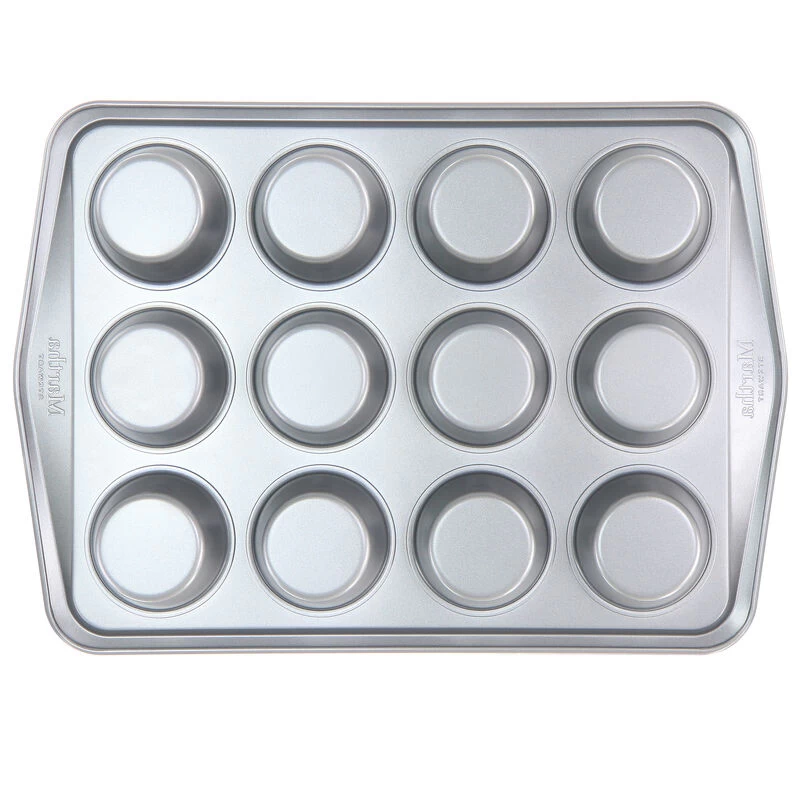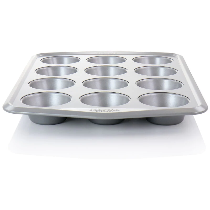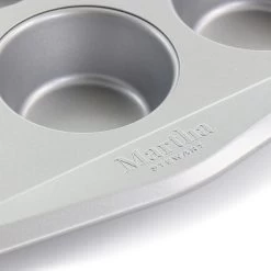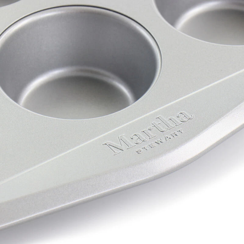 Bake to your heart’s content with the Martha Stewart 12 Cup Nonstick Carbon Steel Muffin Pan in Gray. The warp resistant baking pan evenly heats and browns. Features wide handles and rim for easy handling and durability. The nonstick coating provides quick food release for perfect muffins. From long lasting care, its recommended to hand wash. Bake banana nut muffins, bite sized quiche, or mini custard tarts for family and friends to enjoy! Item Dimensions: 15.75″ x 11.25″ x 1.25″ Item Weight: 1.40lbs