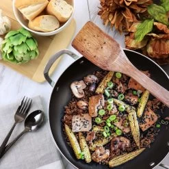 Enjoy making all your favorite home cooked meals with the Martha Stewart 12 Inch Aluminum Nonstick Essential Pan with Lid in Turquoise. Made of durable heavy gauge aluminum for even heat distribution. The reinforced triple-layered nonstick interior makes it super easy for food release. The beautiful turquoise porcelain enamel exterior adds a long lasting shine and quick clean up. The riveted stainless steel handles adds stability and strength, complete with holes for hanging storage. It is oven safe up to 480 degrees Fahrenheit and is PFOA-free. This Martha Stewart chef’s pan is just one of the amazing pieces you can get for your home kitchen. Complete the entire collection to truly feel right at home. Item Dimensions: 22.50″ x 12.00″ x 3.50″ Item Weight: 4.50lbs