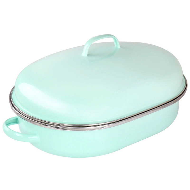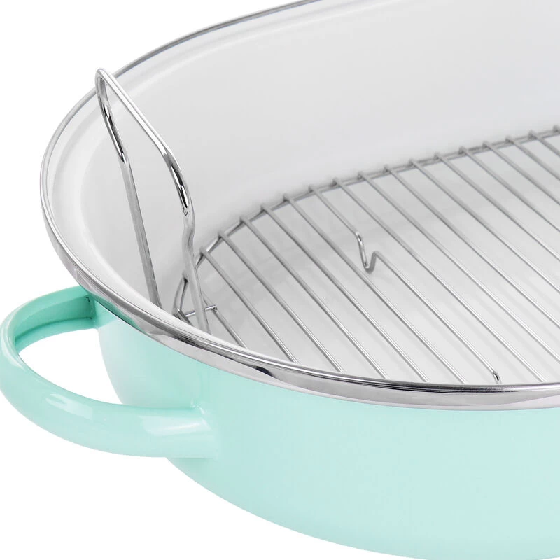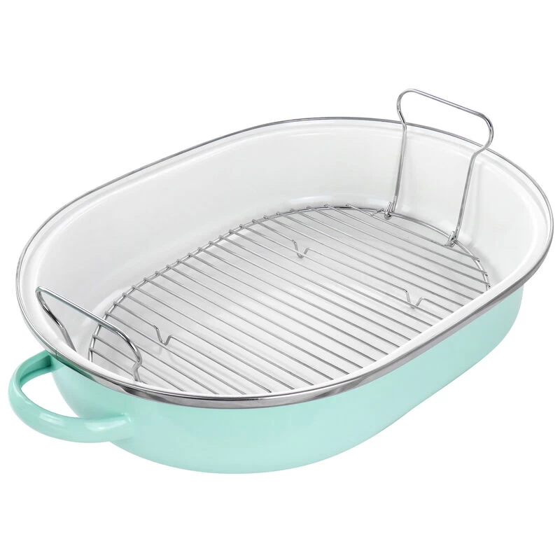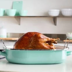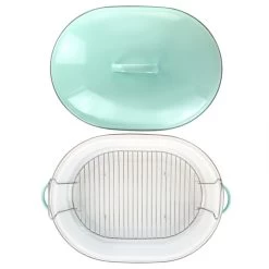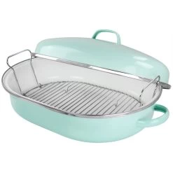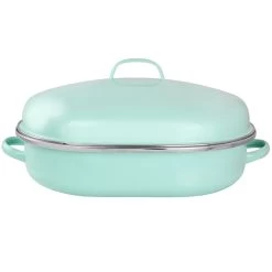 What’s a Sunday without a roast? The ultimate show-stopping dinner is but a simple supper to cooks who use Martha Stewart’s Enamel Oval Roaster. Constructed from quick-heating steel (and coated with a gorgeous blue enamel, which wipes down easily for convenient cleaning), this Roaster features a lid to lock in flavor and moisture while cooking – no dry turkey or brisket will emerge from your oven. Topped with wide handles on the sides of the bottom pan and top of the lid, this Roaster is easy to hold, transport, and bring to the table so your hungry guests can get a full view of their fresh-from-the-oven dinner. Item Dimensions: 21.50″ x 14.20″ x 9.50″ Item Weight: 8.90lbs
