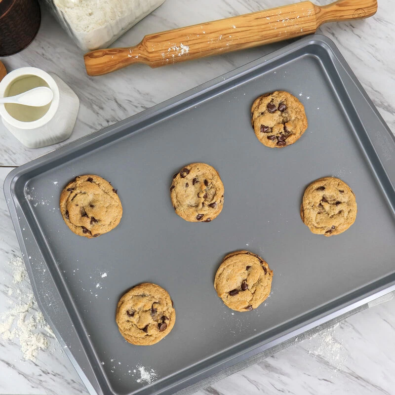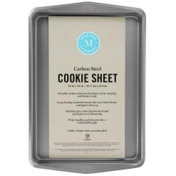 The Martha Stewart 18in Cookie Sheet is constructed with durable carbon steel that resists warping and heats evenly. Long lasting nonstick interior for easy food release and quick clean up. Medium grey color absorbs heat and promotes even browning. Wide handles and rim provide a comfortable grip. Item Dimensions: 18.00″ x 13.00″ x 1.00″ Item Weight: 2.30lbs