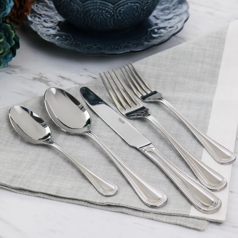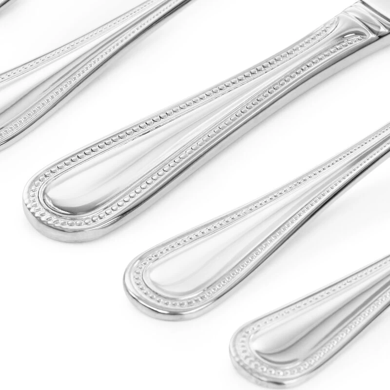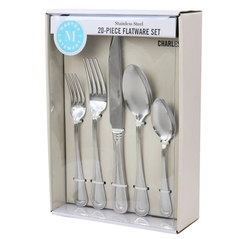 The Martha Stewart Charles 20 Piece Flatware set comes with full service for four people. Including dinner forks, salad forks, dinner spoons, teaspoons, and dinner knives, this set will complete your table. Constructed with heavy weight stainless steel material, it is sure to last you through countless dinners. A beautiful ornate embossed rim adorns each handle and adds a touch of classic elegance to this set. Dishwasher safe utensils- avoid detergent containing lemon for a longer last. Item Dimensions: 3.00″ x 7.50″ x 11.00″ Item Weight: 3.45lbs
