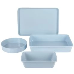 Set includes: One 15in Cookie sheet, one 13in rectangular bake pan, 8in round cake pan, one 9x5in loaf pan
