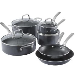 Suit up the kitchen work area with the Martha Stewart 10 Piece Aluminum Nonstick Enamel Cookware Set in Gray with Lids. The nonstick coating allows for more forgiving cooking and provides a fast cleanup. Its aluminum body evenly distributes heat and is oven safe up to 480F. For long lasting quality its recommended to hand wash the cookware. Create the perfect pasta dish, simmer beautiful bechamel sauce, or make a savory steak for dinner tonight. Item Dimensions: 0.00″ x 0.00″ x 0.00″ Item Weight: 0.00lbs