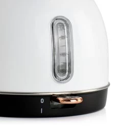 Add a touch of Style and fashion with the MegaChef 1.8 Liter Half Circle Electric Tea kettle in White with Rose Gold finish. This MegaChef 1.8 Liter Electric Kettle adds a flair of retro style to your kitchen decor. Constructed of premium stainless steel body, spout and removable filter. The 1500 Watts of power rapidly boils water for coffees, teas, cocoas, snacks, soups and much more! Water indicator window lets you see exactly how much to fill and how much hot water you have left for serving. . Features boil dry protection, drip free spout and cordless serving. Cord Storage conveniently keeps cord out of sight and your counts clutter free. Item Dimensions: 9.25″ x 8.00″ x 11.00″ Item Weight: 2.55lbs