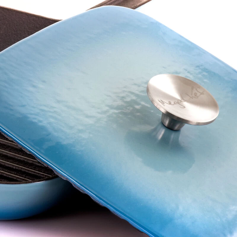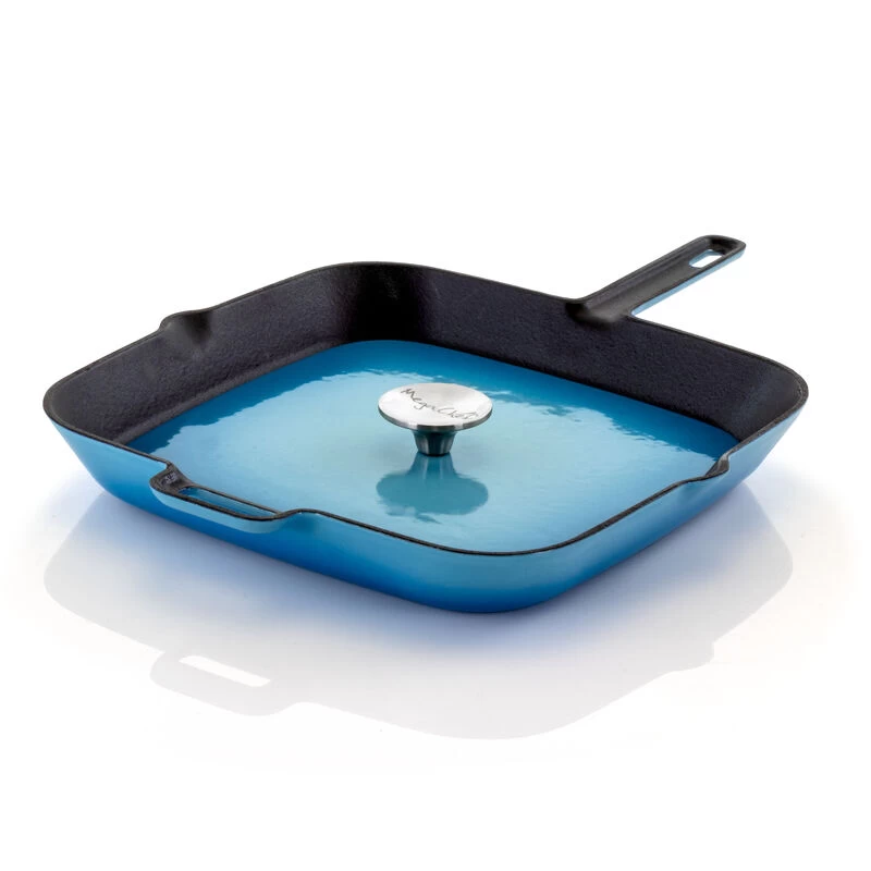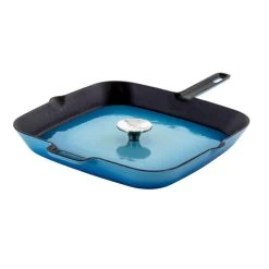 Create spectacular dishes with the MegaChef 11 Inch Square Enamel Cast Iron Grill Pan with Matching Grill Press. Made of non-stick enameled cast iron for healthier meals by allowing cooks to cut down on oils and fats. This colorful grilling skillet provides the user with 2 pouring spouts to better spread delicious sauces over dishes. The durable cast iron material is guaranteed to last along with the outer enameled coating that protects the cookware from more acidic ingredients. Take advantage of the featured heavy press cover to quickly and evenly cook food from both sides. Bring color to the kitchen with the lovely gradient displayed on the underside of this grilling pan. Create a large variety of meals from grilled cheese and panini, to seared steak and grilled chicken! Item Dimensions: 17.50″ x 12.00″ x 1.75″ Item Weight: 12.00lbs