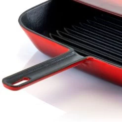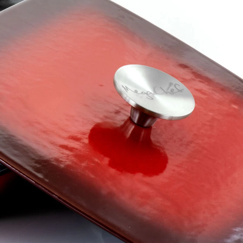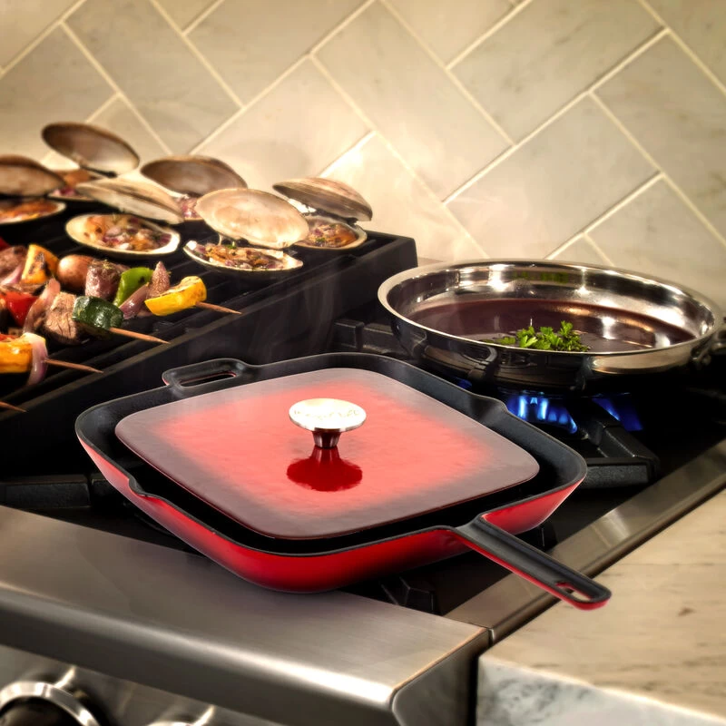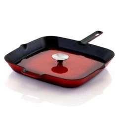 Create spectacular dishes with the MegaChef 11 Inch Square Enamel Cast Iron Grill Pan with Matching Grill Press. Made of non-stick enameled cast iron for healthier meals by allowing cooks to cut down on oils and fats. This colorful grilling skillet provides the user with 2 pouring spouts to better spread delicious sauces over dishes. The durable cast iron material is guaranteed to last along with the outer enameled coating that protects the cookware from more acidic ingredients. Take advantage of the featured heavy press cover to quickly and evenly cook food from both sides. Bring color to the kitchen with the lovely gradient displayed on the underside of this grilling pan. Create a large variety of meals from grilled cheese and panini, to seared steak and grilled chicken! Item Dimensions: 17.50″ x 12.00″ x 1.75″ Item Weight: 12.00lbs