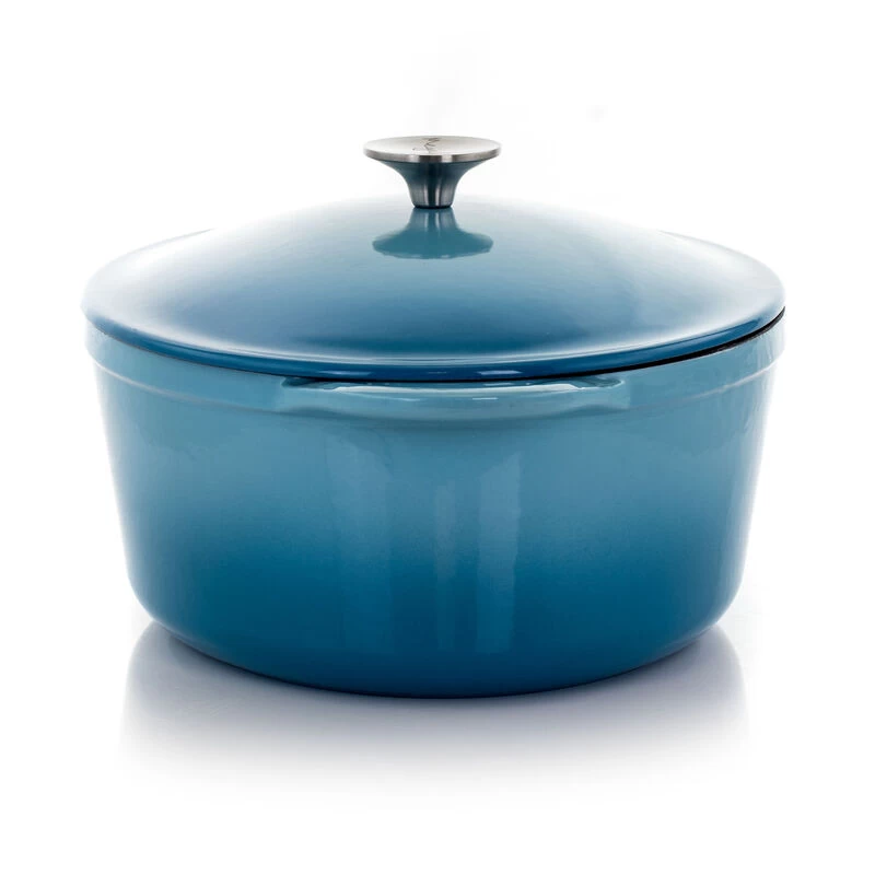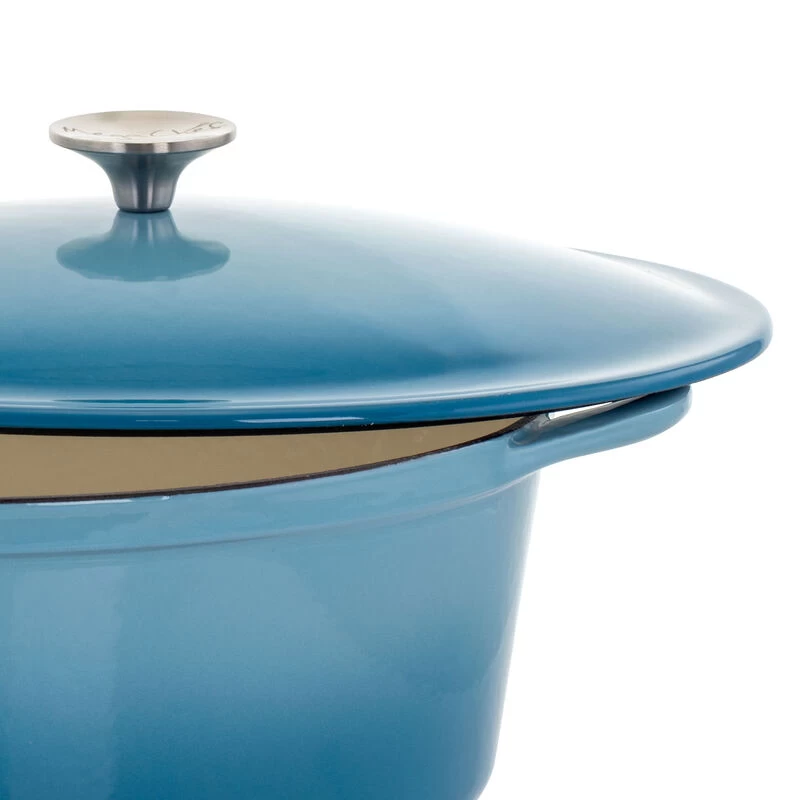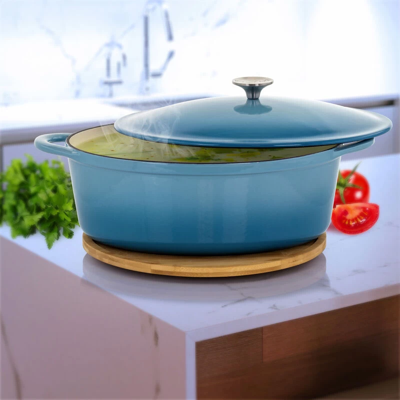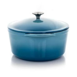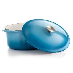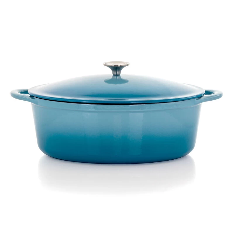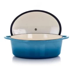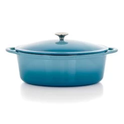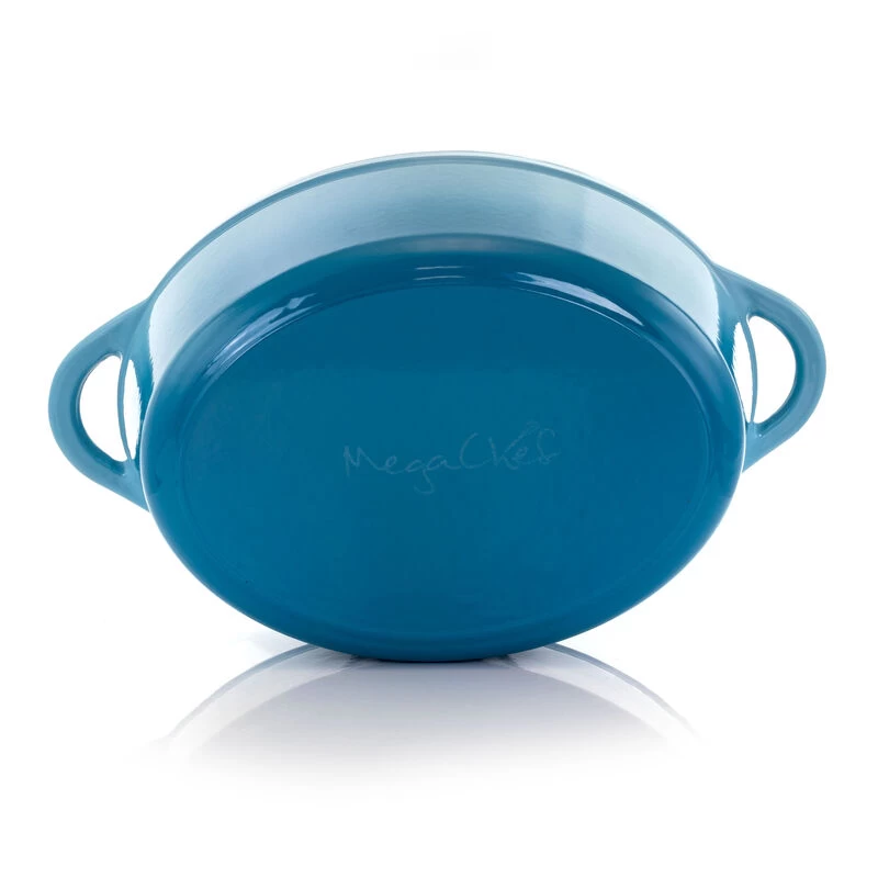 The MegaChef Oval Enameled Cast Iron Casserole in Blue, provides the ideal size and shape for a multitude of dishes. Its cast iron make allows for even and long lasting heat distribution for the evening supper. With an oval shape, the dutch oven can accommodate whole chicken and larger cuts of meat; perfectly suitable for grand dinner parties. Cut down in oils and fats with the non-stick enamel coating, creating healthier daily meals! Create an array of dishes ranging from seasonal delicacies to common year round morsels for all to enjoy! Item Dimensions: 16.50″ x 10.50″ x 15.00″ Item Weight: 15.00lbs