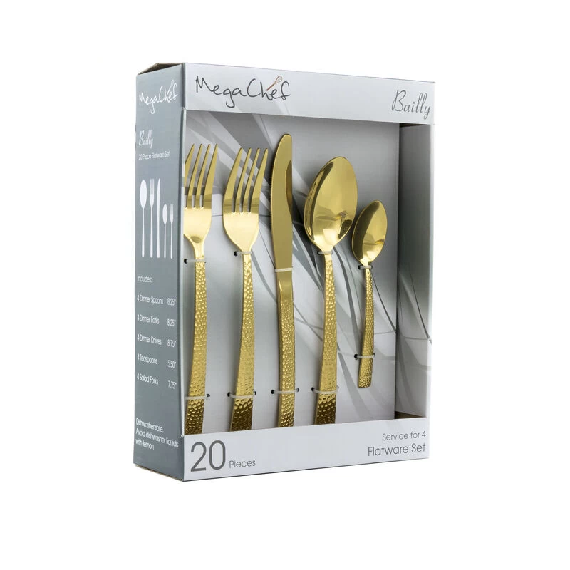 The MegaChef Baily 20-piece Flatware Set is made of food grade stainless steel, the quality material in high standard resists corrosion and rust, ensures long-lasting use. The Baily Silverware Set is smoothly finished with no sharp edges, safe and comfortable for both adults and children. Each piece of Utensil Set in this versatile collection is perfectly weighted and balanced to feel comfortable in your patrons hands and with its proper sizes this set can fit perfectly your other dinnerware or tableware set. Item Dimensions: 9.00″ x 7.00″ x 2.00″ Item Weight: 3.00lbs