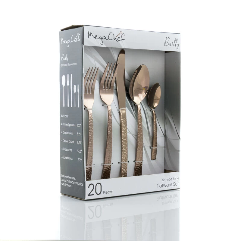 The MegaChef Baily 20-piece Flatware Set is made of food grade stainless steel, the quality material in high standard resists corrosion and rust, ensures long-lasting use. The Baily Silverware Set is smoothly finished with no sharp edges, safe and comfortable for both adults and children. Each piece of Utensil Set in this versatile collection is perfectly weighted and balanced to feel comfortable in your patrons hands and with its proper sizes this set can fit perfectly your other dinnerware or tableware set. Item Dimensions: 9.00″ x 7.00″ x 2.00″ Item Weight: 3.00lbs